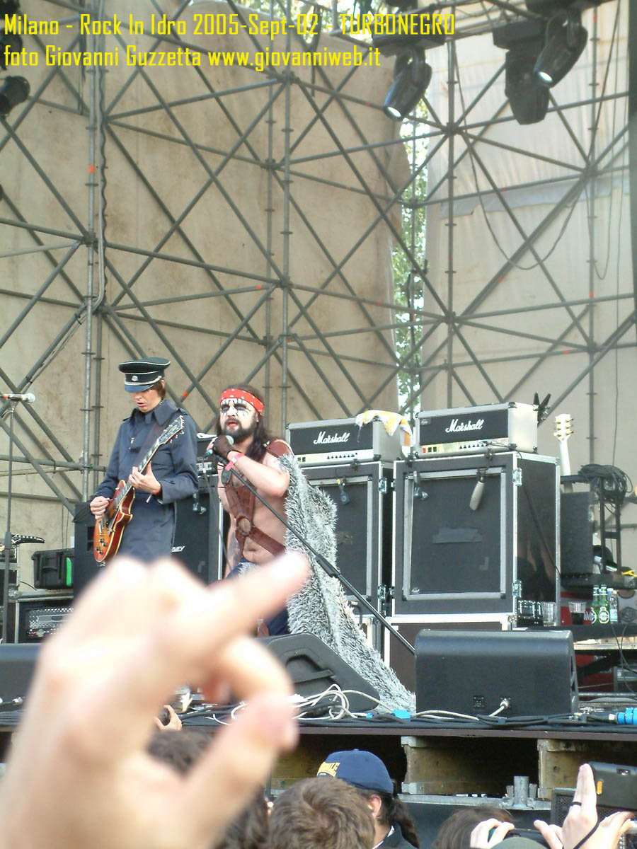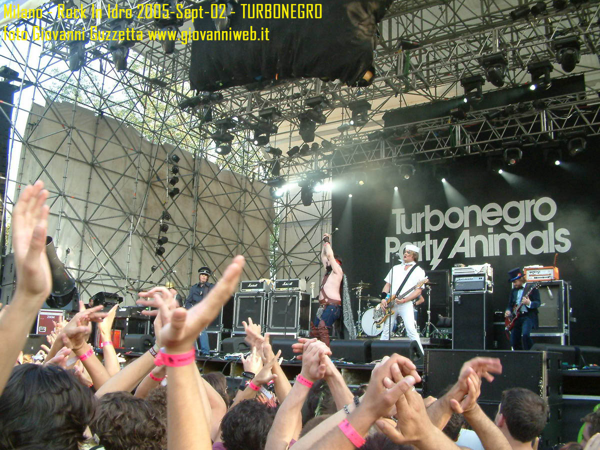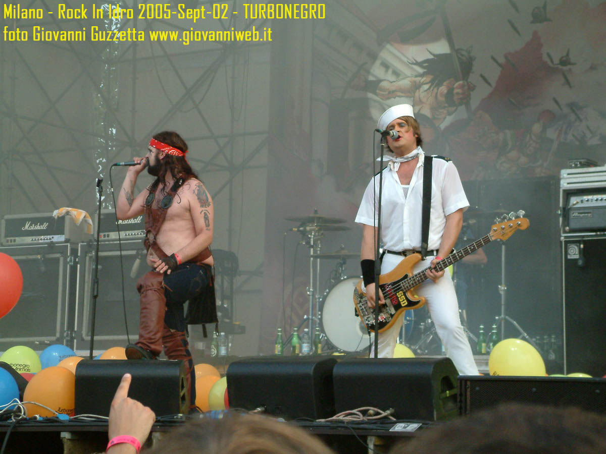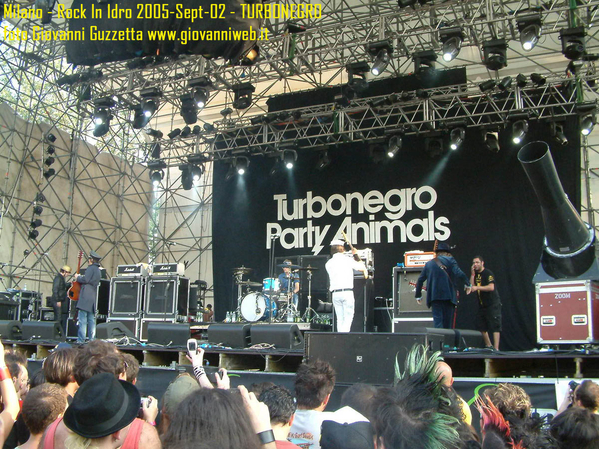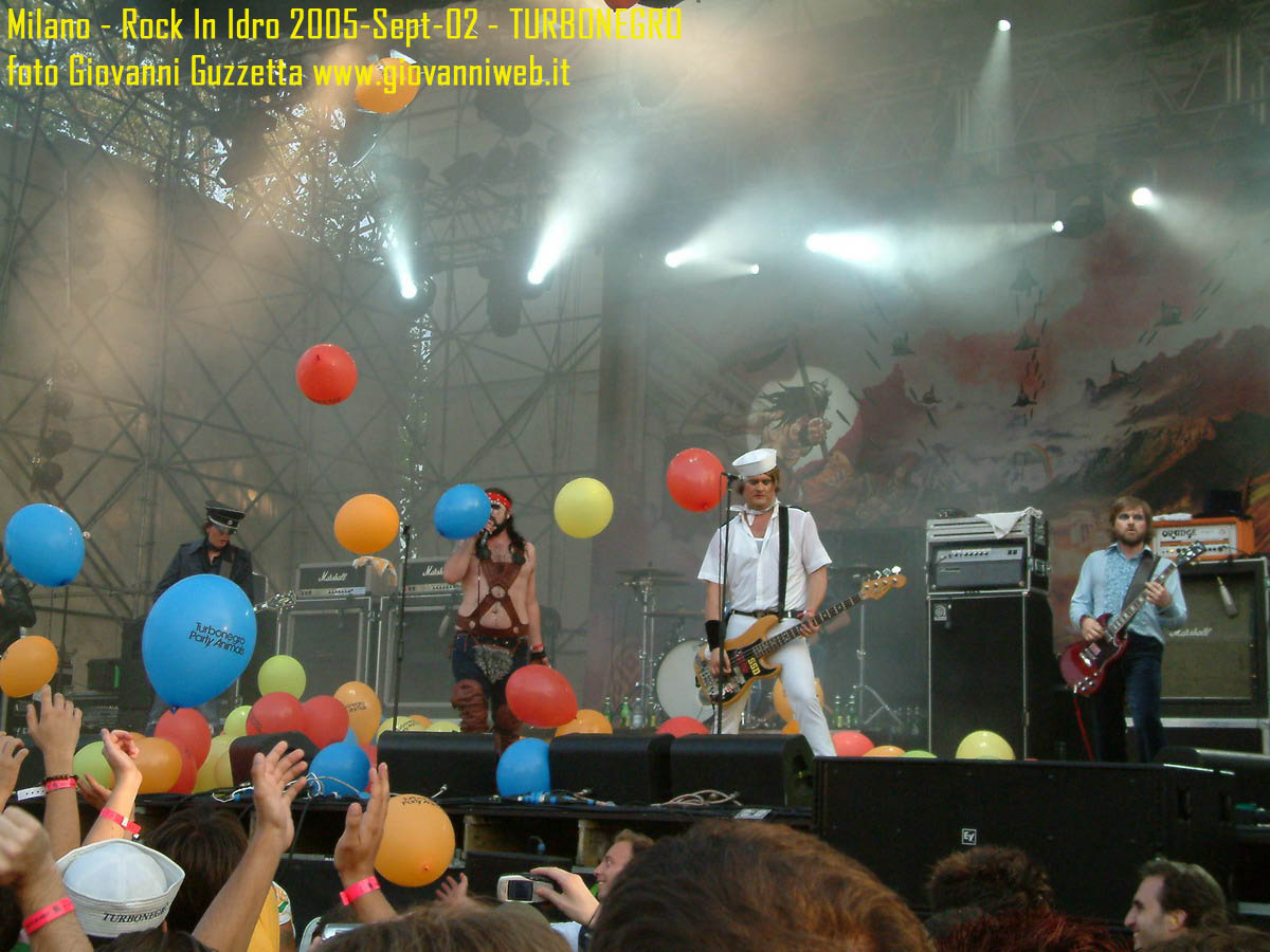 Poche parole di commento, sicuramente interessante la performance di Juliette & The Licks, notevoli gli Hives per presenza scenica e sound veramente stupendo dal vivo, bravi i Super Elastic Bubble Plastic, interessanti Voicst e Useless ID, divertenti i No Use for a Name, i PennyWise e gli Offspring anche se mi fanno riflettere sul tempo che passa, di fatti non c'era molta gente over 25, per di più con i miei pochi capelli non posso permettermi creste punk ma la tigna punk tra un pò. Cmq chemmefrega finchè posso mi godo sti spettacoli, un Festival l'anno di questo tipo mantiene giovani. Ah, capitolo a parte i Turbonegro, musicalmente non sono di certo miei favoriti, ma sono davvero bravi e hanno una organizzazione da palco mostruosa: palloncini che volano, banconote e strisce d'oro CANNONATE contro il pubblico (guardate le foto!) con le facce dei componenti che sculettano qui e là per il palco. Il cantante mi ricorda Abatantuono in ATTILA flaggello di Ddio. Mi sono perso la successiva giornata di Rock in Idro indi non aspettatevi foto di quella data. A seguire qualche foto di gente @ rock inidro così vi potete fare un pò l'idea. Dimenticavo, di contorno erano presenti BMX-ers e Skaters a dilettare con acrobazie i presenti. Mi faccio un pò schifo a dirlo, ma il palco dei non-big non l'ho nemmeno visto se non vuoto, ma ancora non ho il dono dell'ubiquità. A presto e fatemi sapere!!!!! Complimenti ad Af concerti per l'ottiom festival, non mancate alle future edizioni!